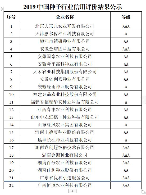 中国种子协会关于2019年中国种子行业信用评价结果的公示