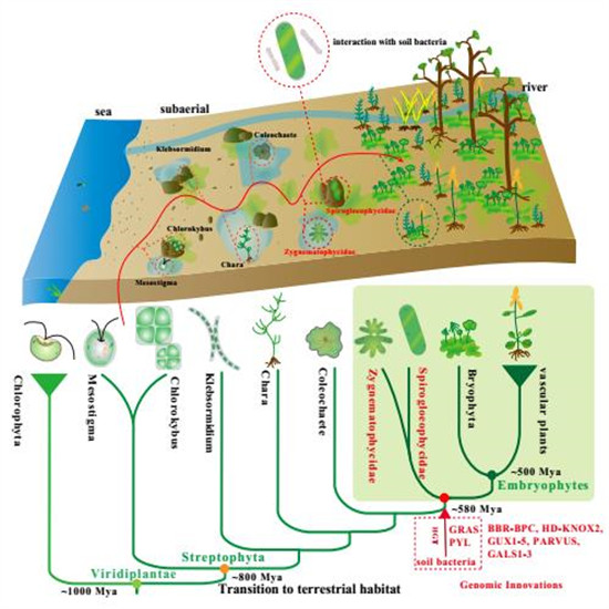 同时,该研究发现,在进化过程中,为了适应陆地环境,陆地植物的共同祖先从土壤细菌中“借”来了两个关键基因:GRAS和PYL,这是大自然自发的“遗传工程事件”,也是陆地植物祖先适应陆地生境的关键分子驱动力。此前这两个关键基因一直被认为是陆地植物所特有的。科研人员发现这次水平基因转移事件发生的时间约为6亿年前,与植物陆地化上岸前的化石时间相吻合。