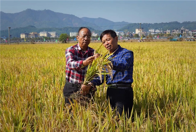 谢华安院士(左)与林文雄教授(右)查看示范片再生稻情况