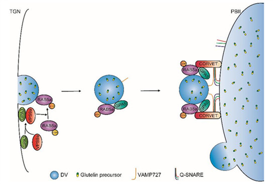 该研究发现了一个新的谷蛋白后高尔基体分选缺陷突变体gpa5,通过图位克隆的方法证实GPA5编码一个具有磷脂结合能力的植物特有调控因子。在胚乳细胞中,GPA5特异分布在致密囊泡外围。亚细胞定位分析证实GPA5的膜定位依赖于前期鉴定的调控因子GPA1/Rab5a和GPA2/VPS9a。生化分析进一步证实GPA5可特异与GPA1/Rab5a的激活形式互作,表明GPA5可能是GPA1/Rab5a的效应因子。后续的功能研究发现,GPA5可与栓系复合体CORVET和含有VAMP727的膜融合复合体SNARE互作来最终介导致密囊泡与蛋白贮藏液泡的融合,以完成谷蛋白的转运。