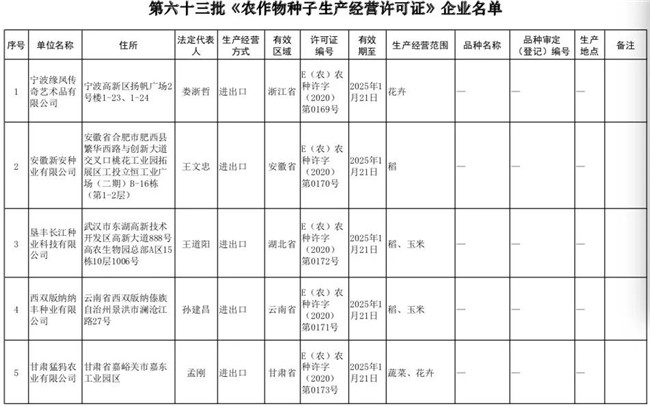 第六十三批《农作物种子生产经营许可证》企业名单