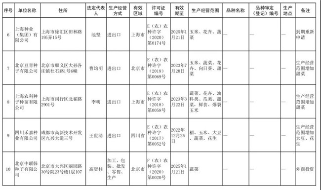 等10家企业《农作物种子生产经营许可证》(详见附件)。