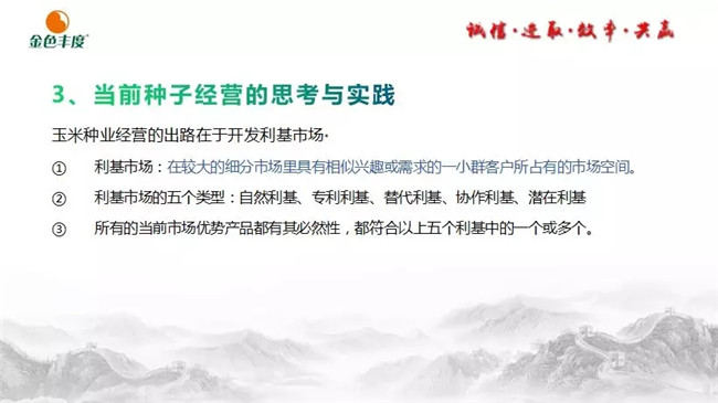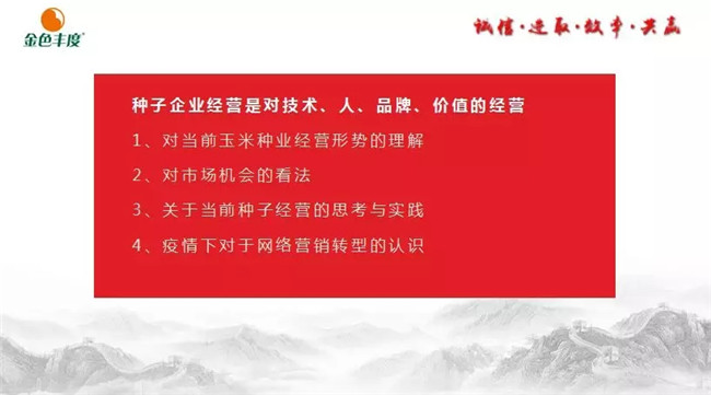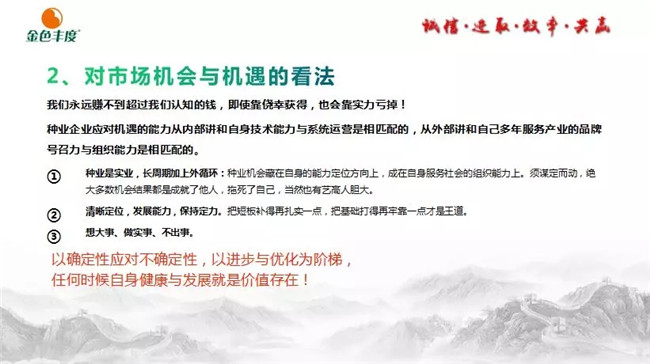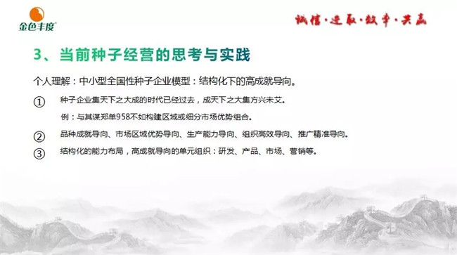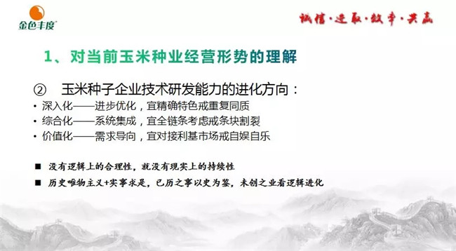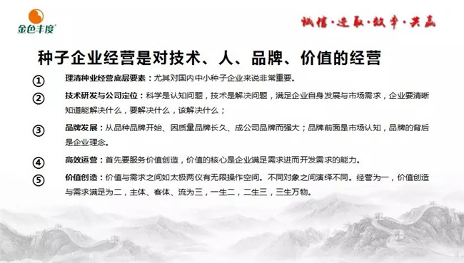 王石在种子行业拥有丰富的理论基础和营销经验。他在报告中指出,种子企业经营是对技术、人、品牌、价值的经营!