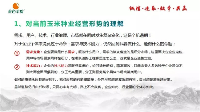 在讲到对当前玉米种业经营形势的理解时,王石说,需求、用户、技术、行业治理、市场都在同时发生复杂变化,这是个机遇期!企业要满足什么需求,服务什么用户。企业的技术能力是服务需求的,如何扬长避短,精准高效,目前来看大多数种子企业是做不到大而全面面俱到的,分工尤其重要。