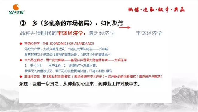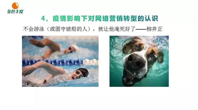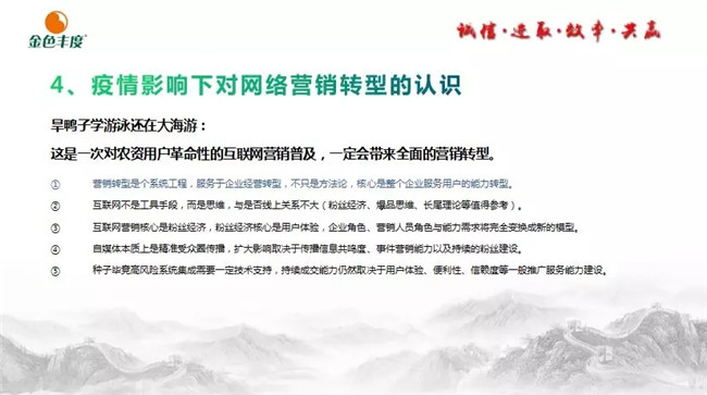 他认为,营销转型是个系统工程,服务于企业经营转型,核心是整个企业服务用户的能力转型。互联网不是工具手段,而是思维,与是否线上关系不大。互联网营销核心是粉丝经济,粉丝经济核心是用户体验,企业角色、营销人员角色与能力需求将完全变换成新的模型。自媒体本质上是精准受众圈传播,扩大影响取决于传播信息共鸣度、事件营销能力以及持续的粉丝建设。种子毕竟高风险系统集成需要一定技术支持,持续成交能力仍然取决于用户体验、便利性、信赖度等一般推广服务能力建设。