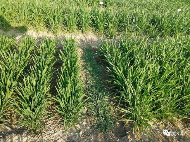 有时我们可以看到或听到有人将小麦冻害发生的原因罗列成多种,譬如不恰当的播期、播量,整地质量低下、墒情表现不足等等,看似都有道理,但我要说的是,在同等条件下,小麦冻害的发生主要就一个因素——品种抗寒性不行!在没有冻害发生的年份,小麦不同品种间的越冬表现没有什么差异,表现都一样;但当有冻害发生的年份,我们就会发现,不是所有的品种都有冻害发生,同样的地块和栽培管理模式下,不同品种间冻害的表现和最终产量都有明显差。这说明,品种抗寒性不行是发生冻害的主要因素。如下图1所示,春性强,颜色淡,幼习直立……