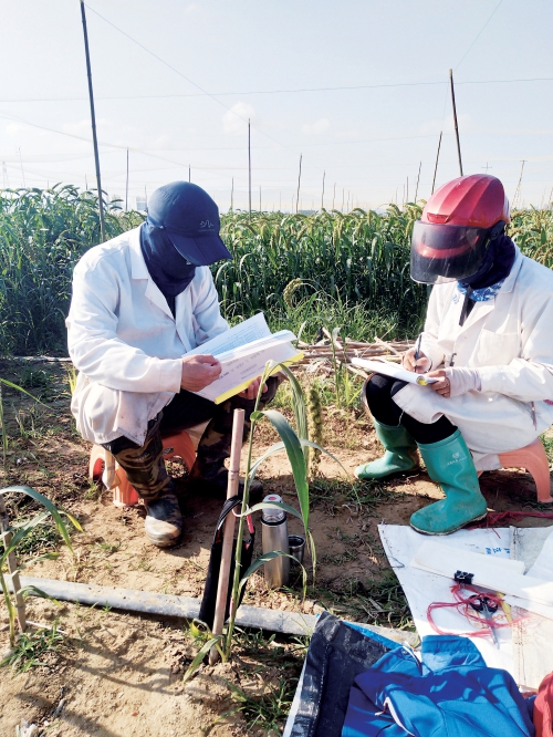 “刁现民研究员和他的夫人智慧研究员正在田间进行调查记录。张宝青 摄