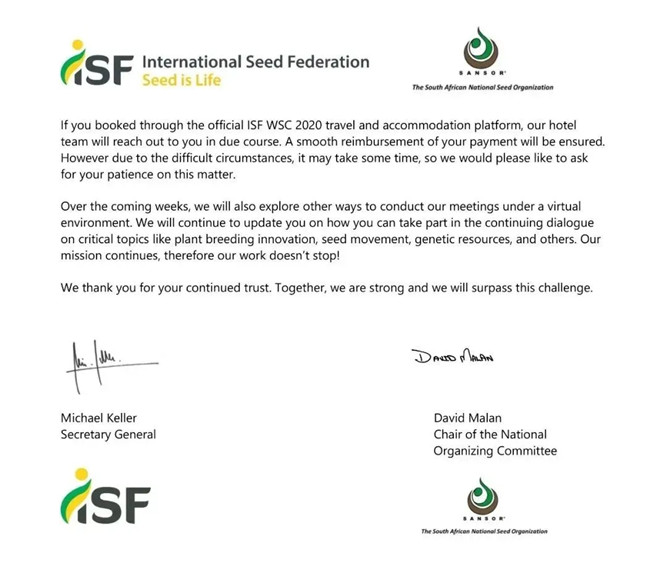 我们一直密切关注COVID-19的疫情情况,并在3月5日和3月13日发送的通知中告知了我们掌握的最新情况。经过与南非国家组委会、主要大会服务商以及合作伙伴的进一步讨论,我们为您和全球种子产业做出了最好的选择。