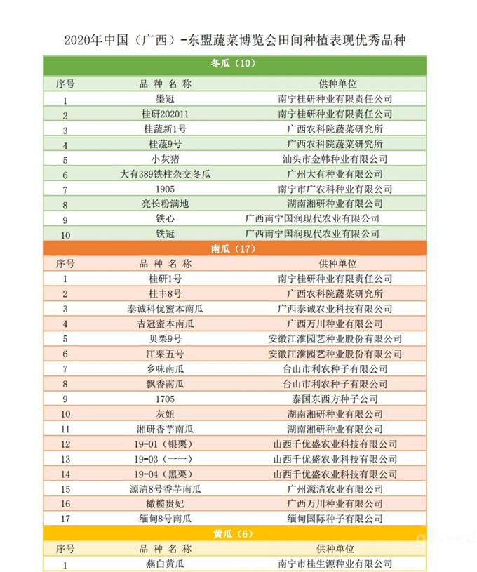 经组织有关专家评审,2020年中国(广西)—东盟蔬菜新品种博览会组委会公布了一批田间种植表现优秀品种(丝瓜、豆角、朝天椒未到成熟期),名单如下: