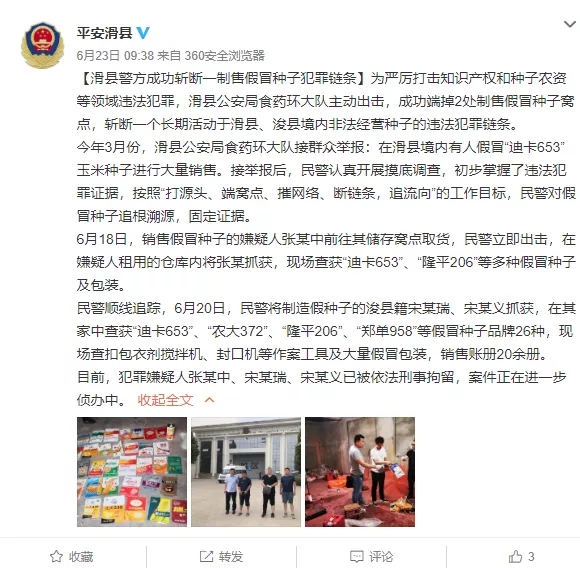 为严厉打击知识产权和种子农资等领域违法犯罪,滑县公安局食药环大队主动出击,成功端掉2处制售假冒种子窝点,斩断一个长期活动于滑县、浚县境内非法经营种子的违法犯罪链条。