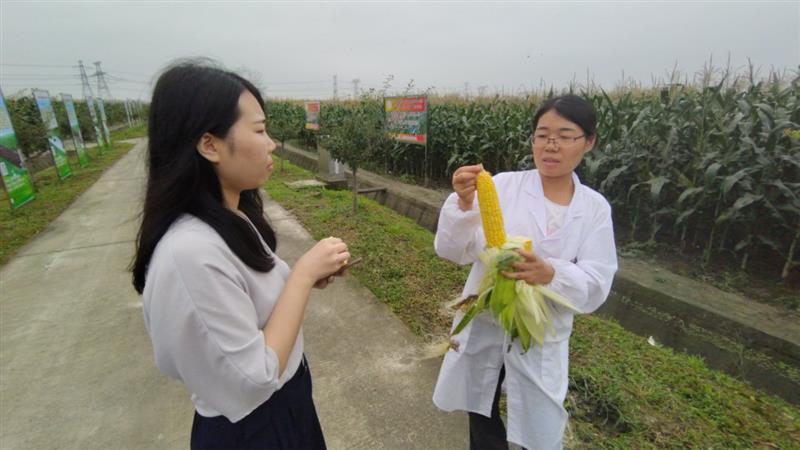 玉米中心团队成员韩晴(右)在上海农科院庄行基地向农民日报记者介绍鲜食玉米新品种成果