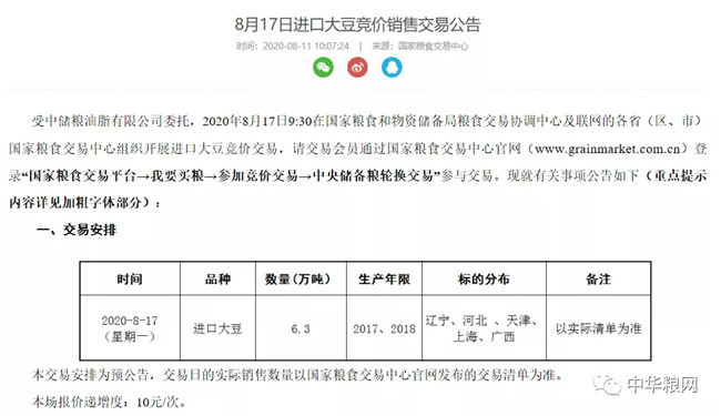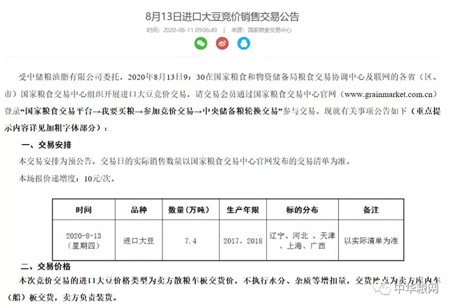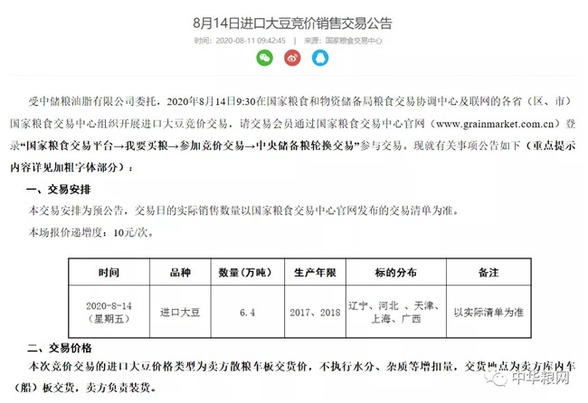 此外,昨日(8月11日)中储粮网终于发布了国产大豆拍卖公告。