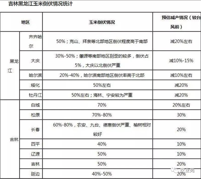目前,看来玉米倒伏情况较为严重,但对产量的影响还需继续观察,目前来看减产的幅度相对有限,预计整体减幅在20%左右。吉林、黑龙江大部分玉米已进入蜡熟期,玉米籽粒中干物质平均已形成八成产量;玉米茎秆折断率比较低,茎秆折断的玉米占倒伏玉米的1%-2%,未贴地的玉米后续还可生长。