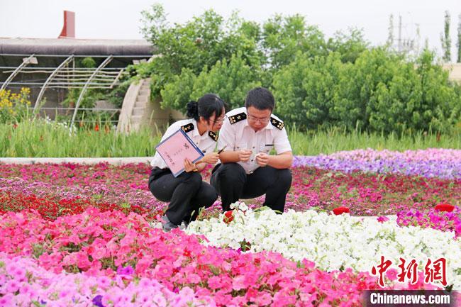 图为兰州海关所属酒泉海关工作人员对花卉外繁制种基地开展田间病虫害监测。(资料图)兰州海关供图