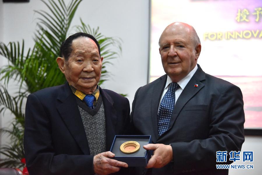 11月16日,智利驻华大使路易斯·施密特·蒙特斯向袁隆平颁发“中智建交50周年纪念奖章”。新华社记者 周勉 摄