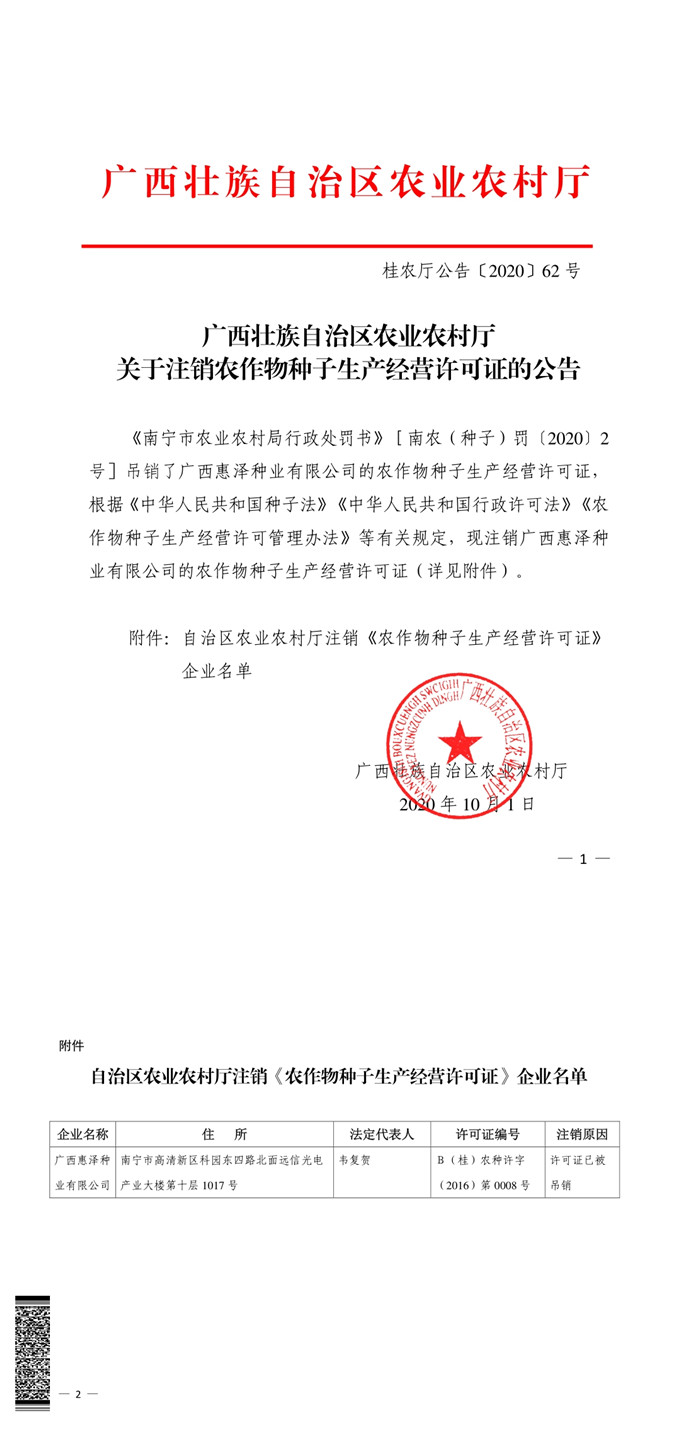 广西壮族自治区农业农村厅关于注销农作物种子生产经营许可证的公告(桂农厅公告〔2020〕62号).pdf