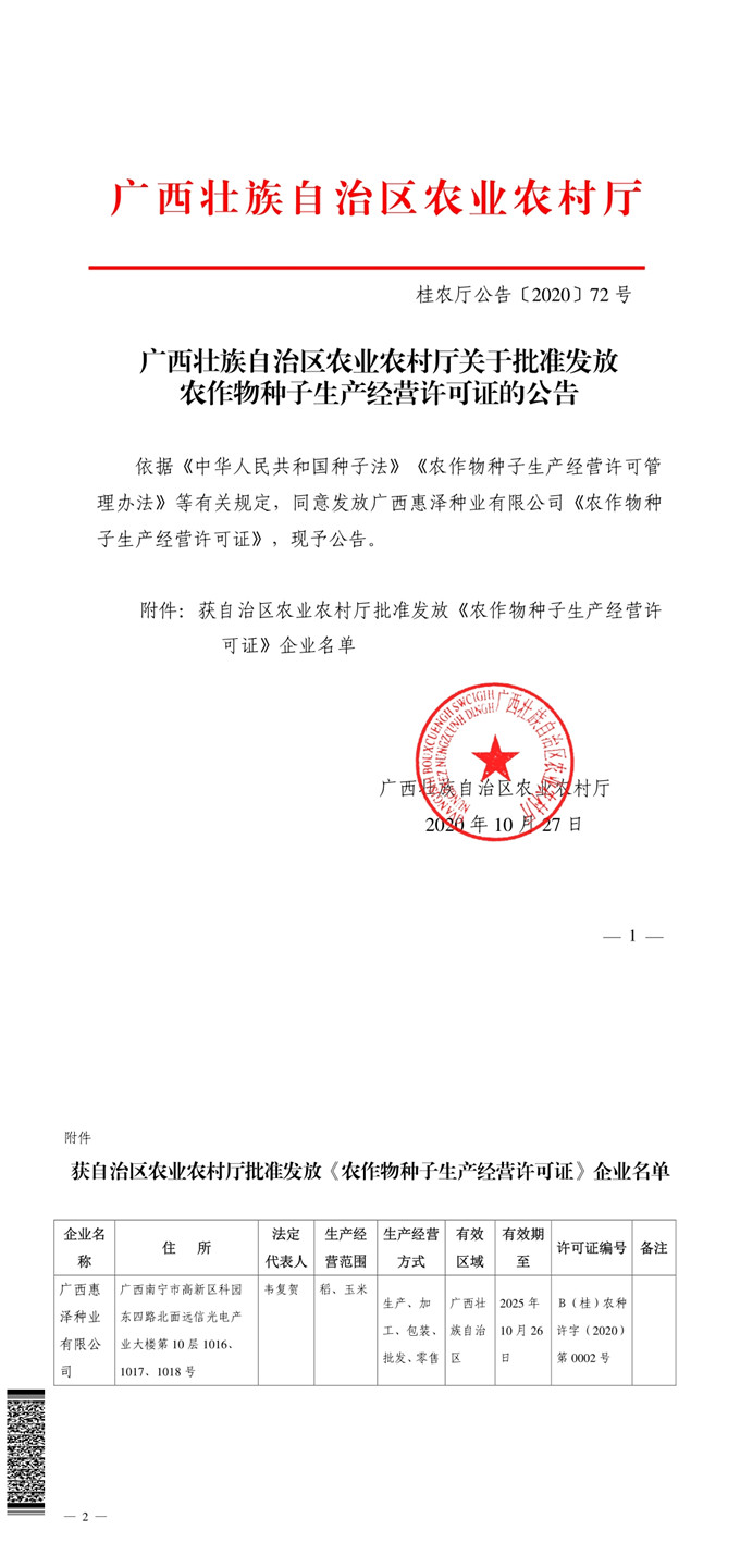 广西壮族自治区农业农村厅关于批准发放农作物种子生产经营许可证的公告(桂农厅公告【2020】72号).pdf