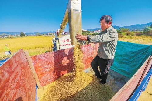 近日,江西省抚州市广昌县头陂镇锡坊村枫坑组种粮大户正在收割晚稻。 曾恒贵 摄