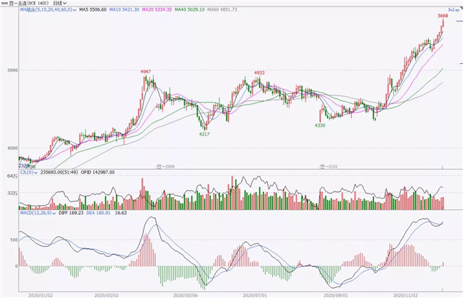 今年7月初,豆一期货曾涨至4933元/吨的阶段新高,时间经过4个月后,大豆价格并未因新豆上市而有所回落,反而越涨越猛。11月30日,能代表国产大豆价格的豆一期货主力合约继续强势攀升,刷新上市以来5596元/吨的高位,涨至5668元/吨,较年初(3856元/吨)上涨1812元/吨,涨幅达47%;黑龙江省内部分区域的豆价已突破2.6元/斤,比去年同期上涨了50%左右。