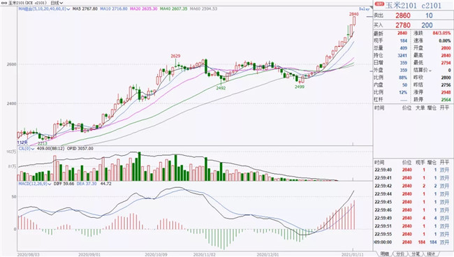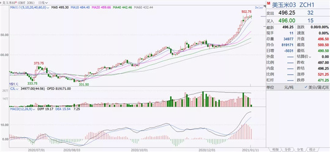 玉米经过几番小波折后,在岁末年初风云再起,内外盘期货、现货市场都同步出现大涨走势,再次成为粮食市场吸睛点,每日都是高潮迭起,让用粮企业和贸易商欲仙欲死!用粮企业收不到玉米,只能被迫每天上涨价格,农户和贸易商都捂紧了玉米,舍不得出手,造成了一个有价无市的市场怪圈。如果说市场价格处于明显低位时出现这种情况倒是很正常,但是现在是玉米市场价格已创出历史新高,与替代品价差明显,那么毫无疑问,当前的玉米已进入一种疯狂的模式。