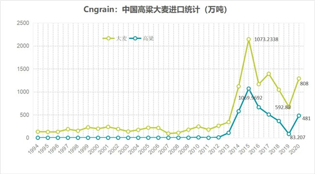 2020年中国高粱进口量高达481万吨,同比提高478.6%;12月份进口量为55万吨,同比提高13.6倍。