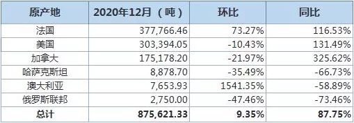 海关统计数据在线查询平台公布的数据显示,我国2020年12月小麦进口量为87.6万吨,较前月增加9%,较去年同期攀升88%。