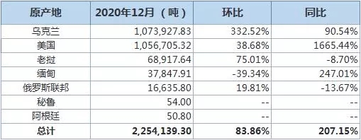 我国12月玉米进口量为225.4万吨,较前月增加84%,较去年同期增两倍。