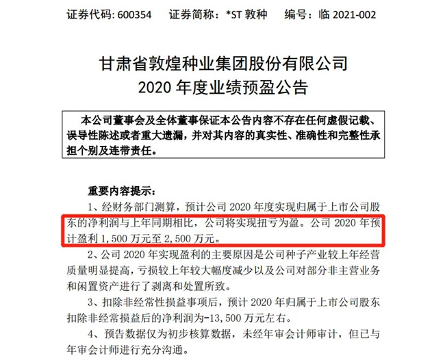 1月28日,甘肃省敦煌种业集团股份有限公司(下称“敦煌种业”)(600354)公告,预计敦煌种业2020年净利润与上年同期相比,将实现扭亏为盈。2020年预计盈利1500万元至2500万元。