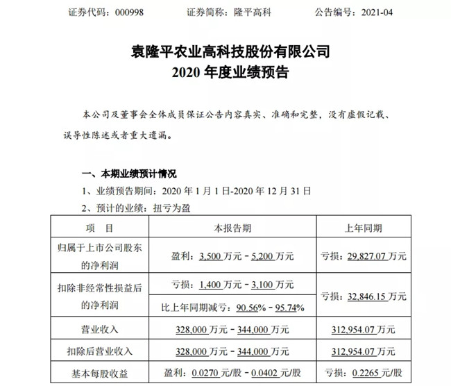 近日,袁隆平农业高科技股份有限公司(下称“隆平高科”)发布2020年度业绩预告,预计2020年度净利润为3500万元-5200万元,上年同期亏损2.98亿元,同比增长111.73%-117.43%,实现扭亏为盈;扣除非经常性损益后的净利润为亏损1400万元-3100万元,上年同期则为亏损3.28亿元。