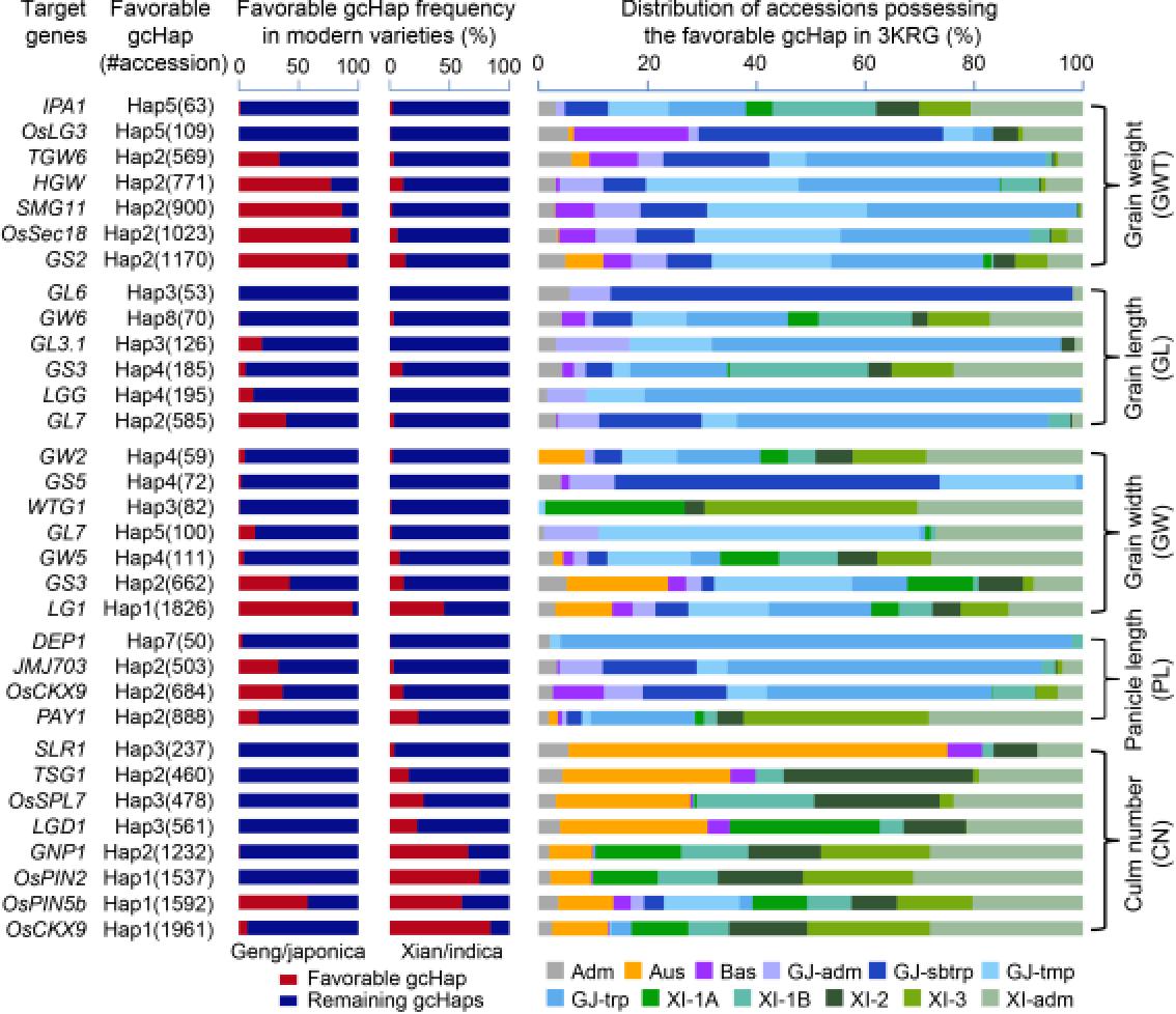 产量相关基因“有利”gcHap在籼粳育成品种中的频率及其在种质资源中的分布(中国农科院供图)