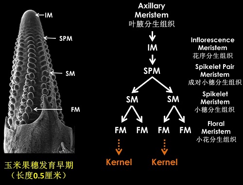 玉米果穗籽粒数目,是在雌花序发育早期形成和决定的。发育过程中,雌花序分生组织持续分化小穗分生组织的能力决定了玉米果穗上最终的每穗行数、行粒数等产量性状。因此,提升玉米花序分生组织活性,理论上可增加果穗籽粒数目,提升产量。