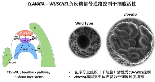 玉米和其他植物类似,维持花序分生组织(干细胞)生长和分化的经典途径是CLV-WUS负反馈信号通路,敲除clavata基因会打破此信号通路平衡,表现为干细胞过度增殖。刘磊供图