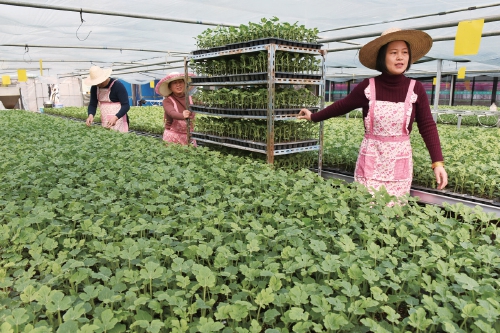 嫁接专业合作社员工在基地里搬运西瓜苗。连日来,该专业合作社抓住气温回暖、雨水充沛的有利时机,集中培育西瓜幼苗,以满足市场和订单农户对春耕种苗的需求。
