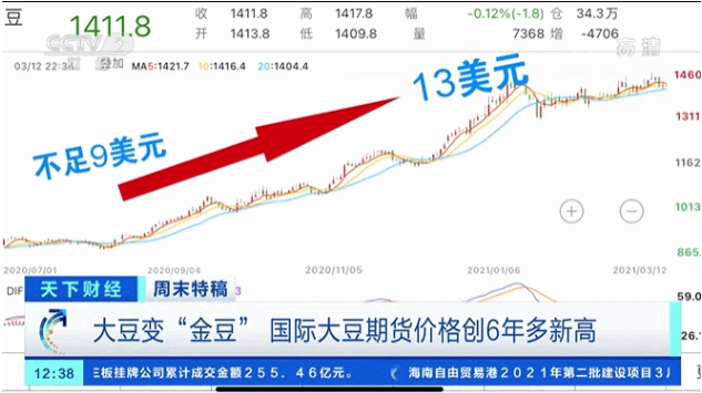 目前,美国芝加哥商品交易所大豆主力合约盘中最高达到每蒲式耳14.6美元,为2014年6月以来交投最活跃大豆合约的最高水平。大豆价格上涨并不是突然出现的,从去年下半年以来,芝商所大豆期货价格便进入了上升通道,价格从6月底的每蒲式耳不足9美元,涨到年底的13美元,今年以来大豆价格一直保持高位运行。