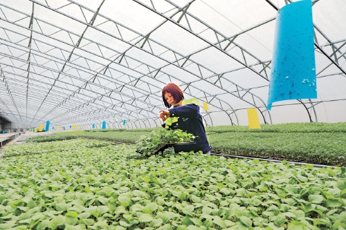 图为近日,在该区毛桥村育苗温室大棚里,村民在管理茄苗。