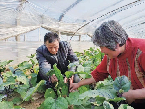 日前,山东省聊城市东昌府区侯营镇赵庄村西头的大拱棚里,张桂兰(右)正手把手指导村民给茄子掐枝。