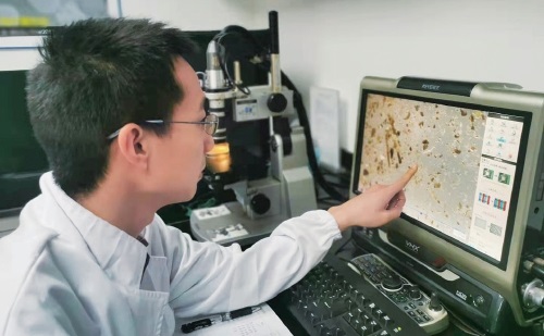 在显微观察室,检测员席昕用200倍显微镜察看土样。在成像仪的屏幕上,0.2毫米的根结线虫清晰显现。然后,席昕用计数皿计算100克土壤中含有多少头根结线虫。