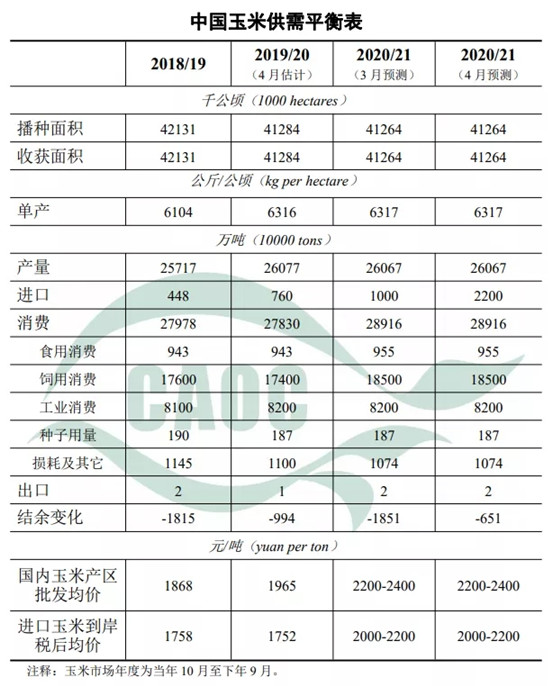 本月预测,2020/21年度中国玉米进口2200万吨,比上月预测数调增1200万吨。从需求来看,生猪产能继续恢复,饲用需求稳定增长,但高价格也将对玉米总体消费形成一定抑制。从供给来看,农户和贸易商手中余粮加快消化,玉米及替代品进口有序到港,超期储存稻谷饲用增加,市场流通粮源较为充足,新季玉米种植意向明显增强,也有利于市场预期稳定。综合来看,短期内国内玉米供需趋于基本平衡,价格大幅涨跌的可能性不大。