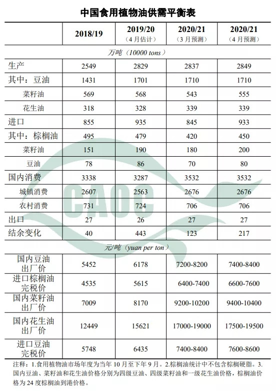 本月预测,2020/21年度食用植物油产量2849万吨,较上月预测值增加126万吨,主要是从俄罗斯等国家进口油菜籽预期增加,带动菜籽油产量调增。长江中下游大部油菜处于开花盛期,江淮、江南中东部以及华南大部气温偏高,墒情良好,总体利于油菜生长,但仍需关注四川南部部分地区旱情对当地油菜生长的影响。本月暂不对油菜籽产量进行调整。食用植物油进口量933万吨,较上月预测值增加88万吨。主要是因为国内食用植物油商业库存处于历史低位,进口需求较高。棕榈油、菜籽油、豆油进口量分别上调30万吨、20万吨、10万吨。受国际价格上涨、国内进口需求增加等因素带动,适当上调食用植物油价格预测区间。