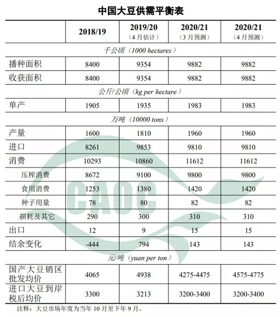 本月对2020/21年度中国大豆供需形势预测与上月保持一致。国内方面,大豆主产区春耕在即,新季大豆种植面积可能减少,加之大豆种植地租等成本增加,支撑国产大豆价格高位运行,预计全年国产大豆销区批发均价区间为每吨4575-4775元,比上月预测提高300元。国际方面,美国农业部(USDA)发布季度谷物库存报告和种植意向报告,美豆库存同比降低,种植面积增幅低于市场预期,引发美豆期货价格上涨,加之全球货币超发,预计国际大豆价格高位震荡。
