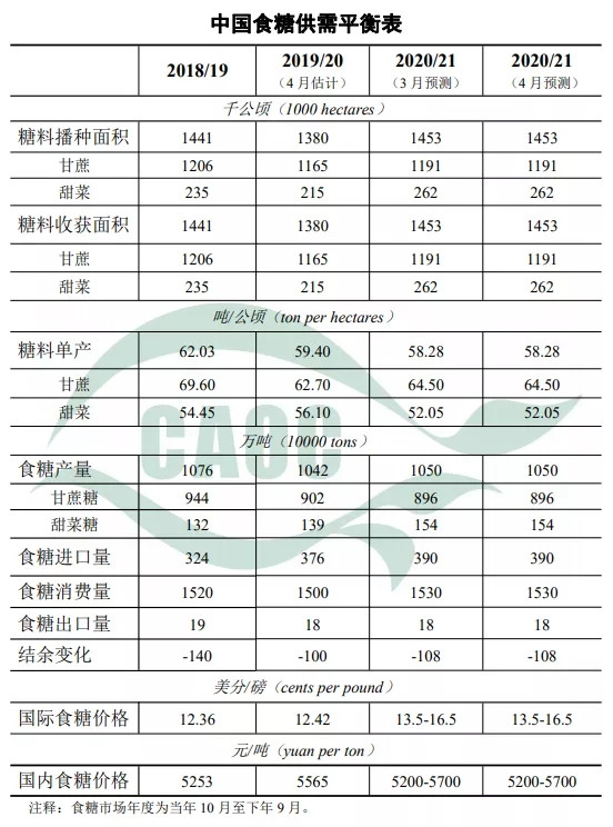 目前,云南瑞丽新冠肺炎疫情使部分糖厂收榨时间延迟。预计4月份,南方平均气温偏高,广西、云南部分蔗区旱情露头。随着天气转暖,食糖消费旺季到来,有利于消化食糖库存。后期需跟踪新冠肺炎疫情、天气和食糖进口等因素对食糖市场的影响。综合判断,本月对2020/21年度的预测数据暂不做调整。