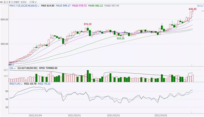 美玉米期货主力合约升至近八年最高,因美国和全球供应紧张。7月玉米合约收盘635美分/蒲式耳,盘中636.5美分/蒲式耳为2013年5月以来的最高价位。本周,7月合约急涨8.2%,为连续第四周上涨。