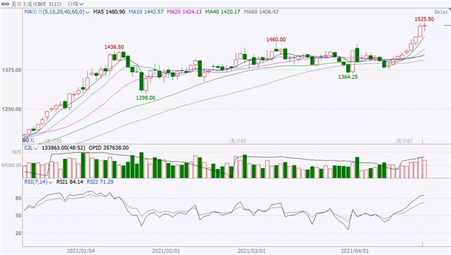 CBOT大豆期货4月23日连续九个交易日上涨,主力合约升穿15美元为2014年6月以来首次。本周美豆上涨6.6%,为连续第四周上涨,创下2019年5月以来的最大单周涨幅。