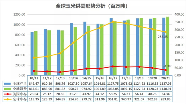 根据美国农业部数据,全球玉米消费量接连四年超过产量。20/21年度全球玉米产量11.37亿吨,消费量11.49亿吨,库存2.84亿吨,同比减少6.3%。美国玉米库存量为近7年最低,为3434万吨,去年同期是4876万吨。