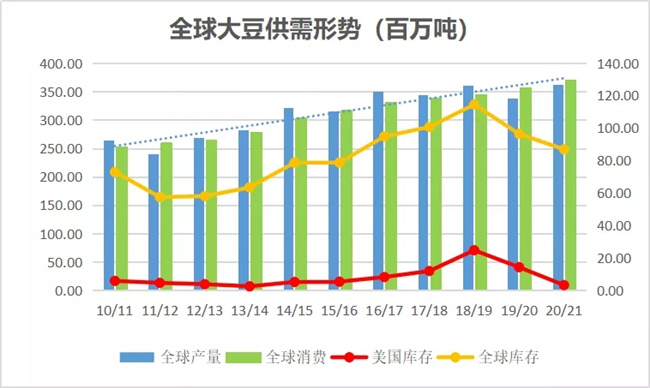 根据美国农业部数据,最近2年全球大豆产不足需。20/21年度全球大豆产量3.63亿吨,消费量接近3.7亿吨,库存8687万吨,为近五年新低。美国大豆库存量为近7年最低, 仅有325万吨,去年同期是1428万吨。
