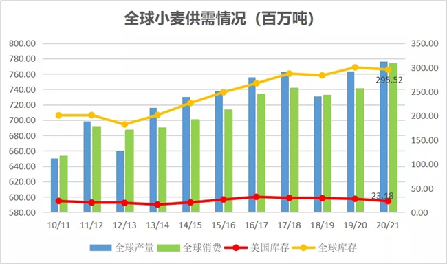 根据美国农业部数据,20/21年度全球小麦产量7.76亿吨,消费量接近7.74亿吨,库存2.96亿吨,低于上年3亿吨的库存水平,但也是历史同期高位。美国小麦库存量为近6年最低,2318万吨,去年同期是2799万吨。