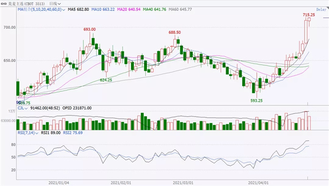 美软红冬小麦期货4月23日继续上涨,主力合约触及2014年以来最高价位,受玉米强劲升势的带动,且市场预期全球饲用小麦需求将上升。CBOT 7月软红冬小麦合约收报每蒲式耳714.5美分,盘中触及每蒲式耳715.25美分的高点,是2014年5月以来的最高价位。7月合约周线上涨9.04%,连升第3周。