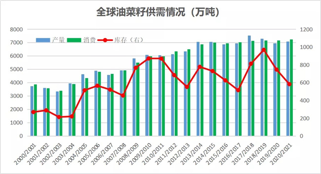 根据美国农业部数据,2020/21年度全球油菜籽产量为7082万吨,进口量为1663万吨,压榨量为6962万吨,期末库存为581万吨,较上月预估环比增加39万吨。但由于全球需求表现仍然维持强劲,导致期末库存仍处于4年来的低位,库存消费比为6.52%,为4年来新低,全球油菜籽供需格局维持偏紧格局。