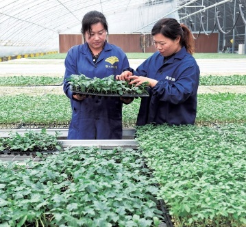 图为江苏省连云港市东海县桃林镇北芹蔬菜育苗基地“新产业工人”正在智能化大棚里为蔬菜种苗清除杂株。