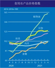 在其他粗粮中,国际大麦和高粱价格继续走软,4月分别下跌1.2%和1.0%,但同比仍分别高出26.8%和86.5%。4月国际小麦价格总体稳定,持续较2020年同期高出17%以上。尽管小麦报价受到玉米价格上涨以及美国和欧洲数国作物状况堪忧的支撑,但全球产量前景向好使价格总体上保持稳定。